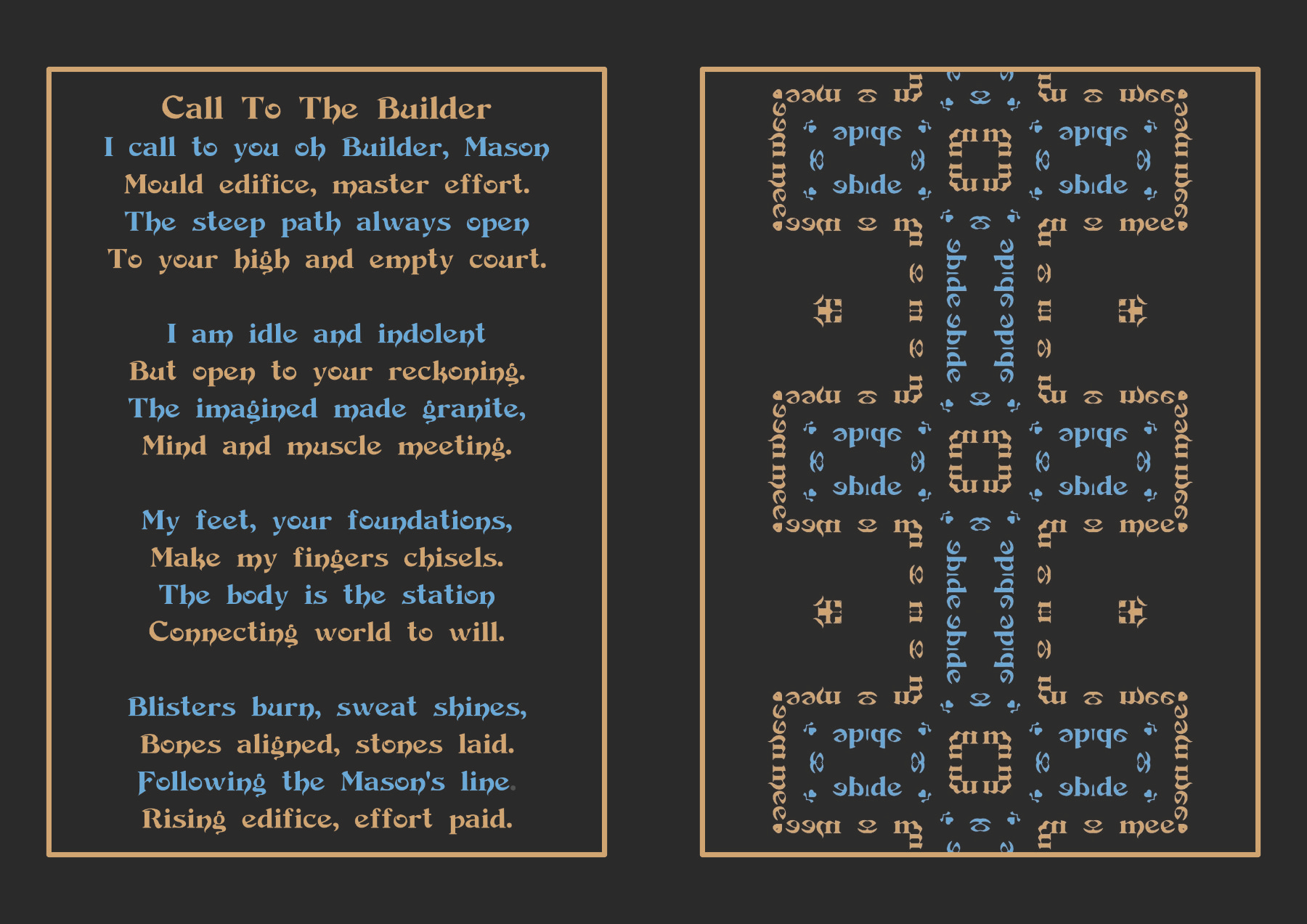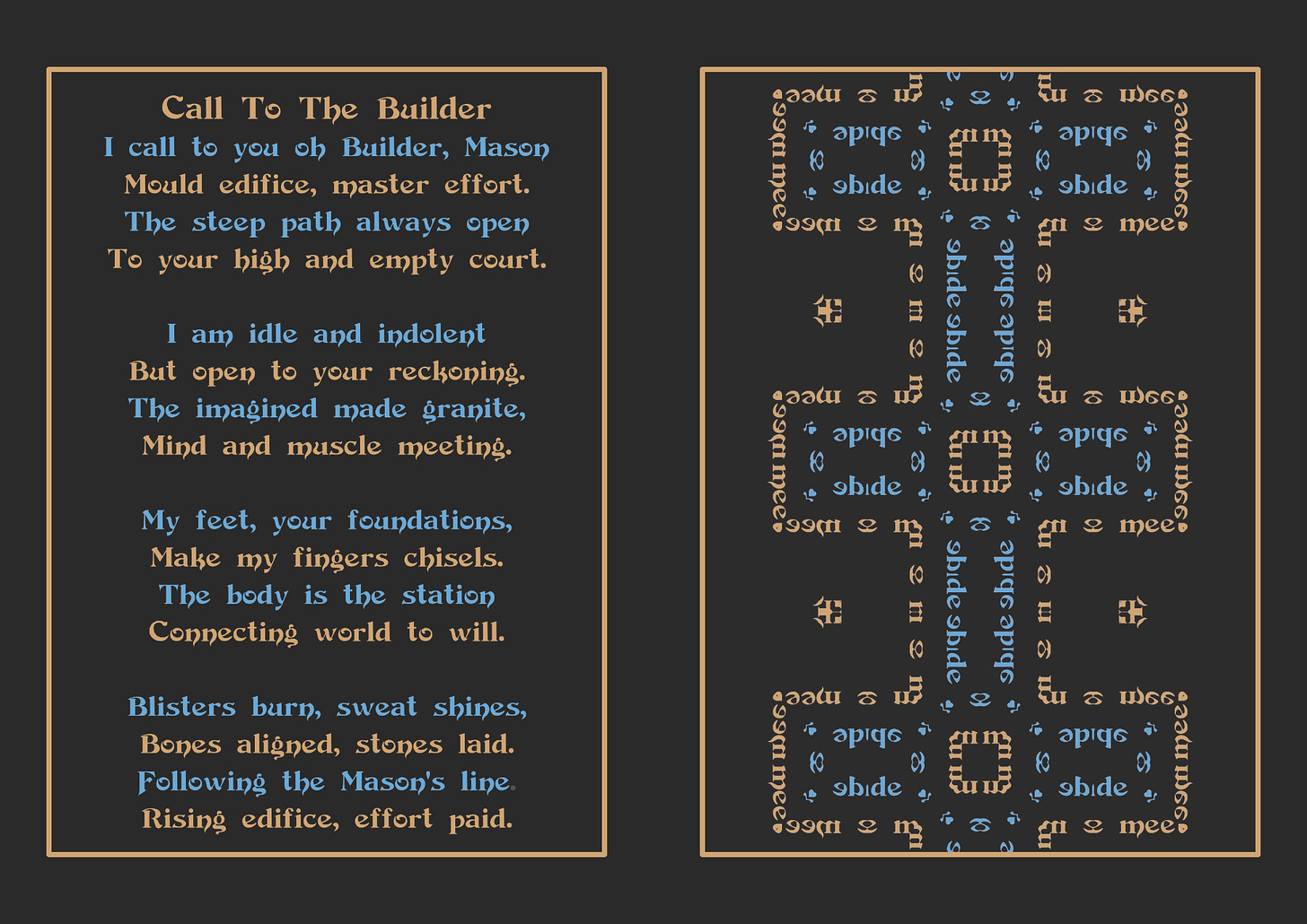 Each poem is a call to an archetype or a specific conceptual idea - eloquence, time, calm and so on. The accompanying mandalas contain the letterforms and intentions of the poems, carrying their messages to a different level of awareness. With these “bardic engineering tools” let us shift our perceptions, even just a little, and in doing so, perhaps reshape our internal universes.