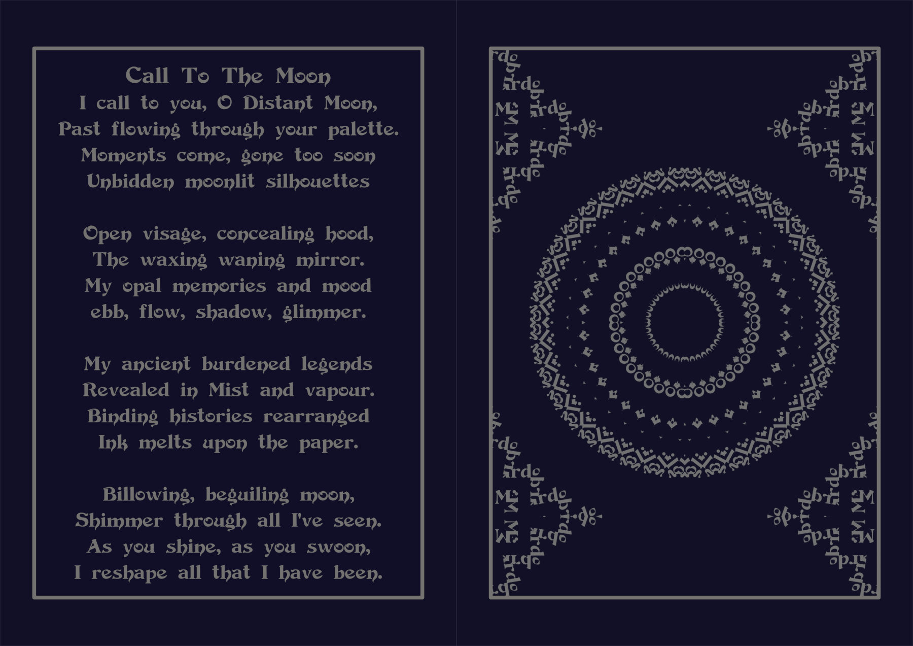 Another piece from my New Book "Chantry Circuitry". It is a series of poetic calls and incantations to Mystical and Archetypal figures. The Mandalas are meditation tools constructed from manipulated images of the poetry. The Audio features a reading by me - as opposed to an automated voiceover. Print and Kindle Version of "Chantry Circuitry" Now Available