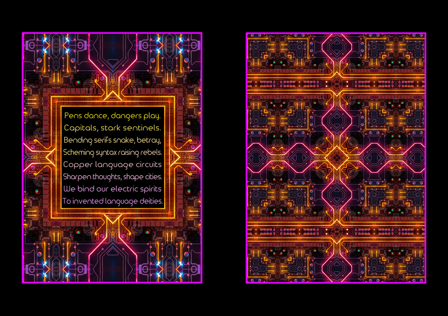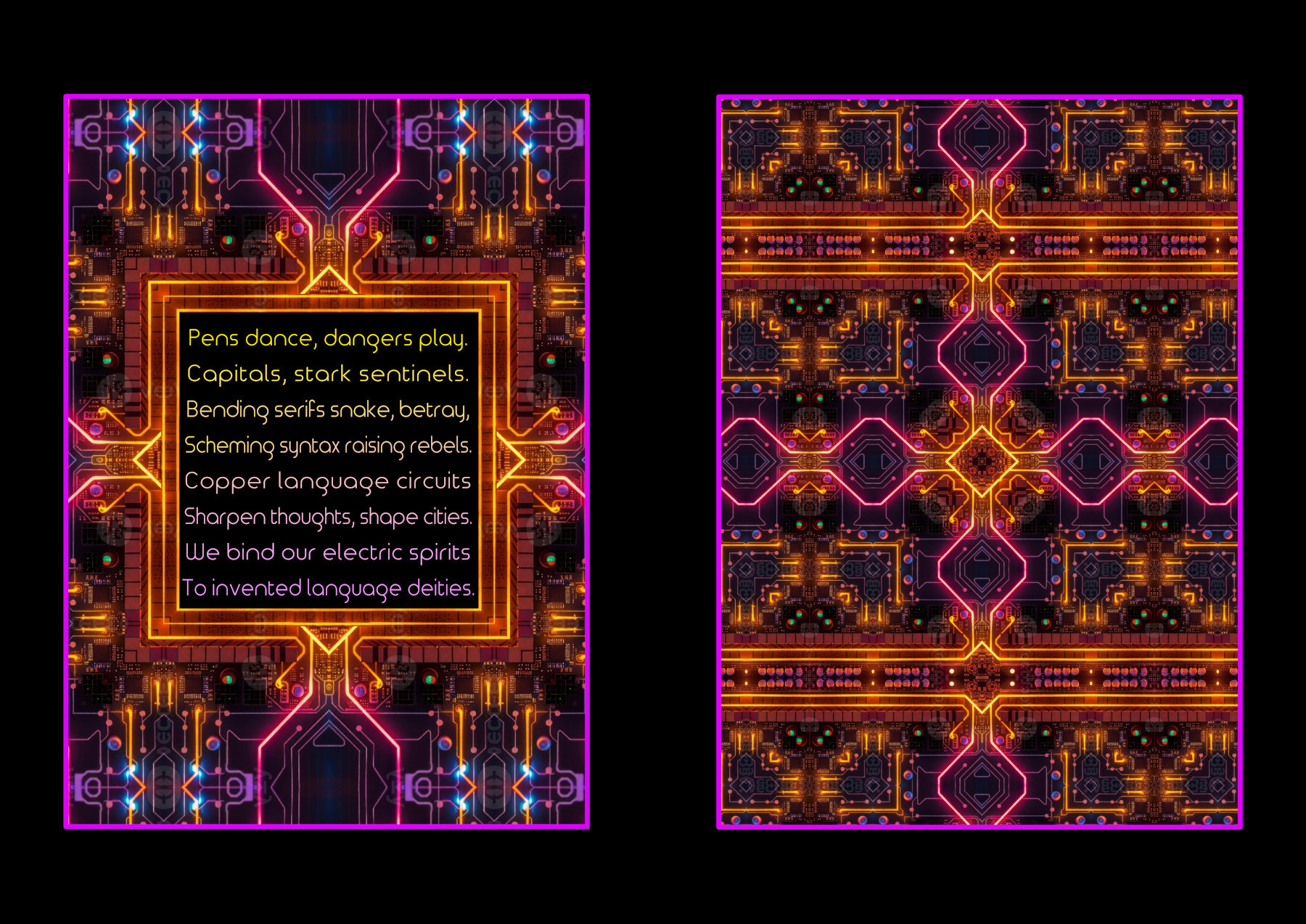 An excerpt from my new book "Chaos Charms". Available Now! (https://www.graememcallister.com/p/chaos-charms-book) Language let us climb, now it constrains us. Other parts of the story are available - https://www.graememcallister.com/t/chaos-charms Copper Language Circuits Pens dance, dangers play. Capitals, stark sentinels. Bending serifs snake, betray, Scheming syntax raising rebels. Copper language circuits Sharpen thoughts, shape cities. We bind our electric spirits To invented language deities.